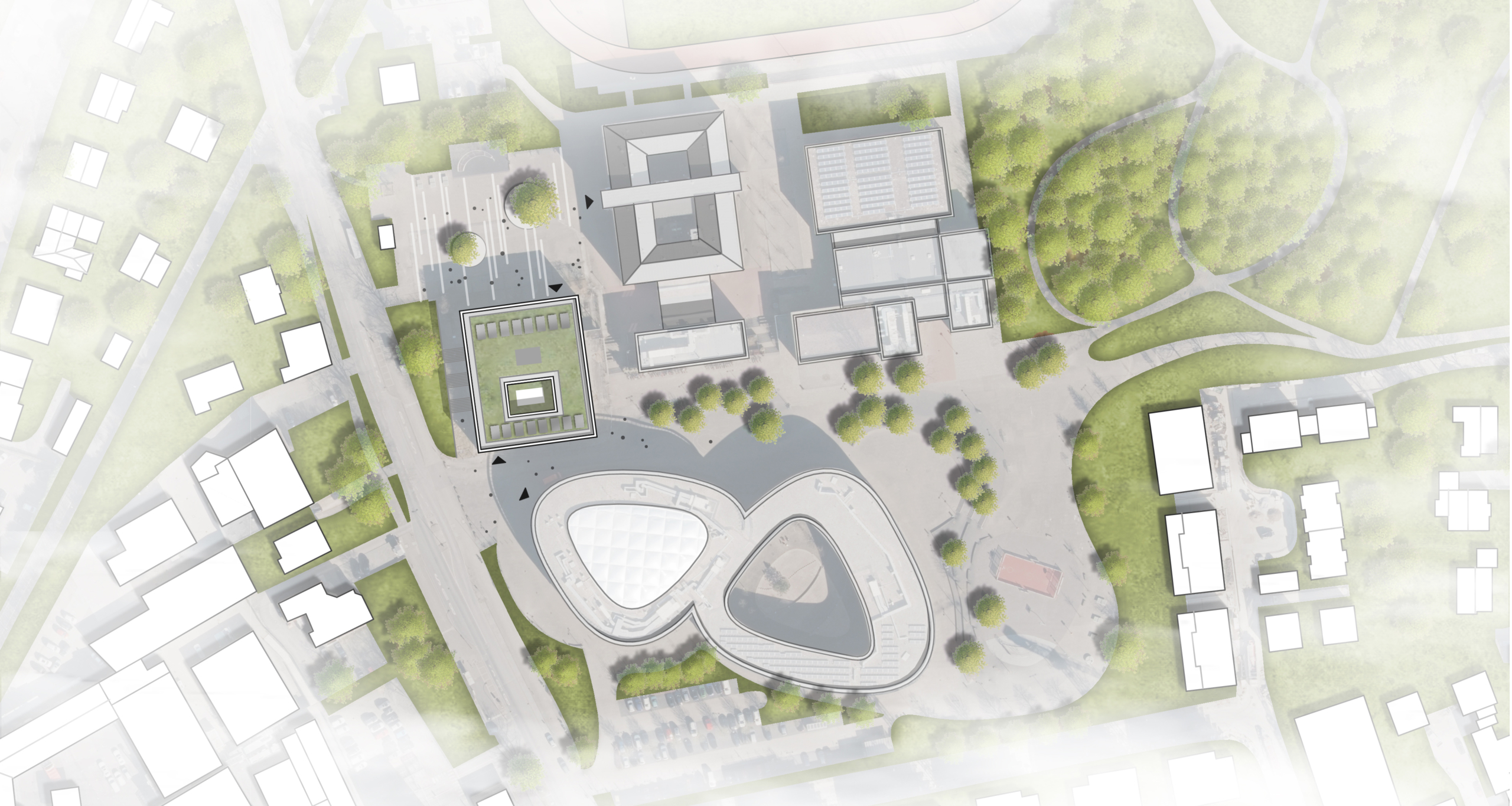 Unser Konzept orientiert sich an der ursprünglichen Gebäudestruktur und schafft klare, barrierefreie Zugänge für beide Schulformen mit eigenen Eingangsbereichen. Gleichzeitig entstehen zusätzliche Klassenräume für beide Schulen des Schulzentrums, die zur Entlastung der bestehenden Raumkapazitäten beitragen. Ein neuer zentraler Versorgungskern bündelt wichtige Funktionen, während die bestehende Rohbaustruktur möglichst erhalten bleibt. Dabei setzen wir auf recyclingfähige Materialien, einfache Konstruktionen und flexible Innenausbauten, die unterschiedliche Lern- und Nutzungsszenarien ermöglichen.